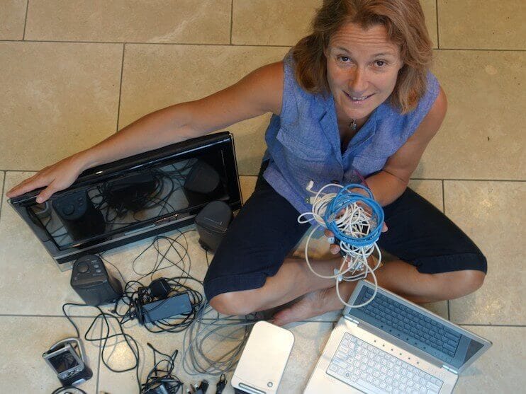 Fiona: Computer, laptop, handheld tablet, three phones, a set of speakers, a single speaker, a tracker, GPS device. Umpteen chargers from every time you get a new phone.