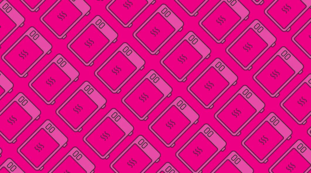 Floating microwaves in a pink haze against a bright pink backdrop